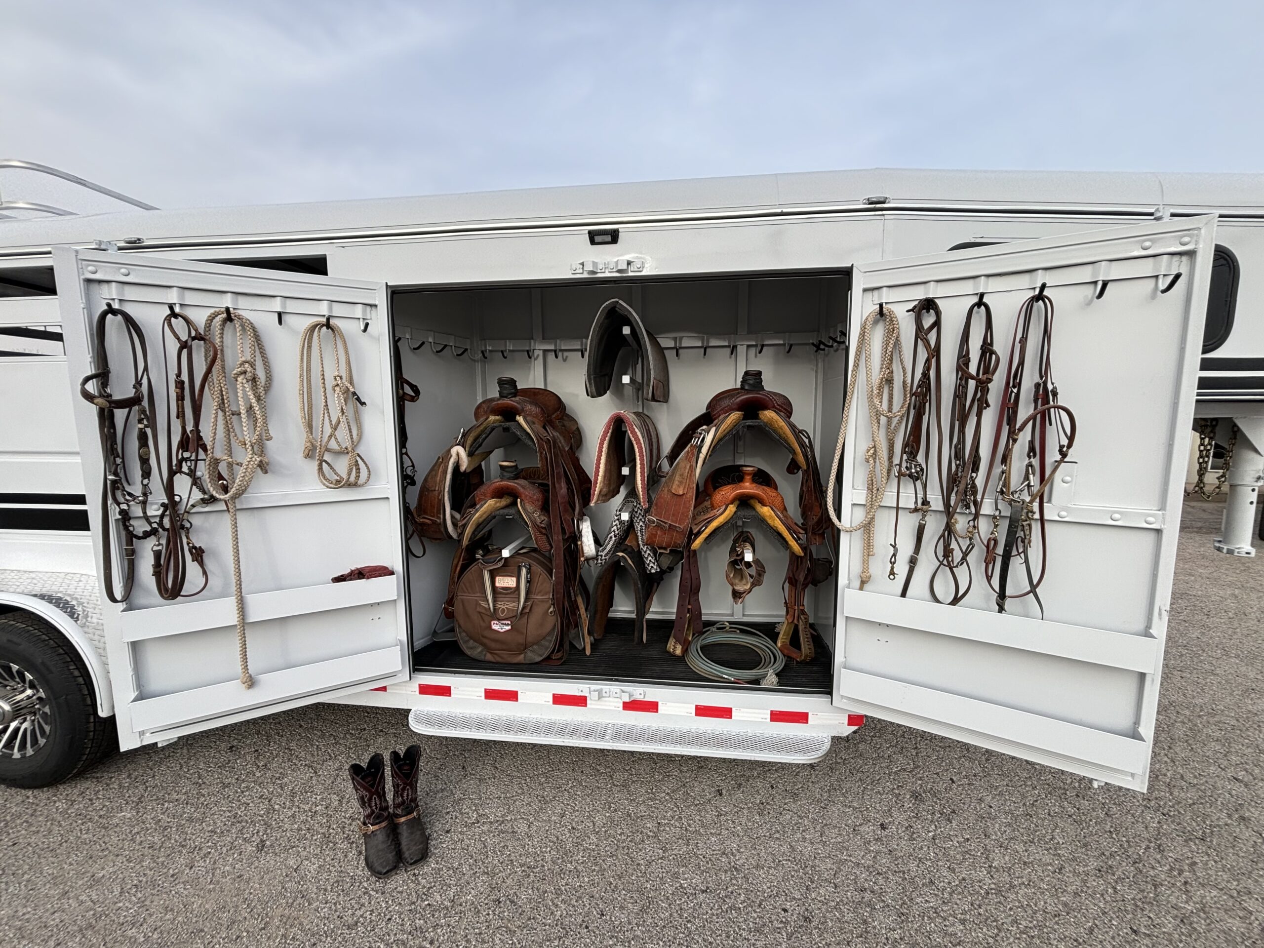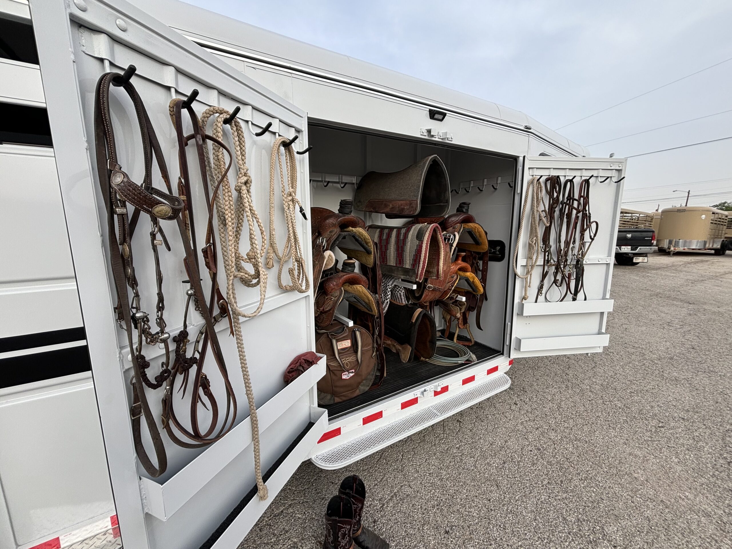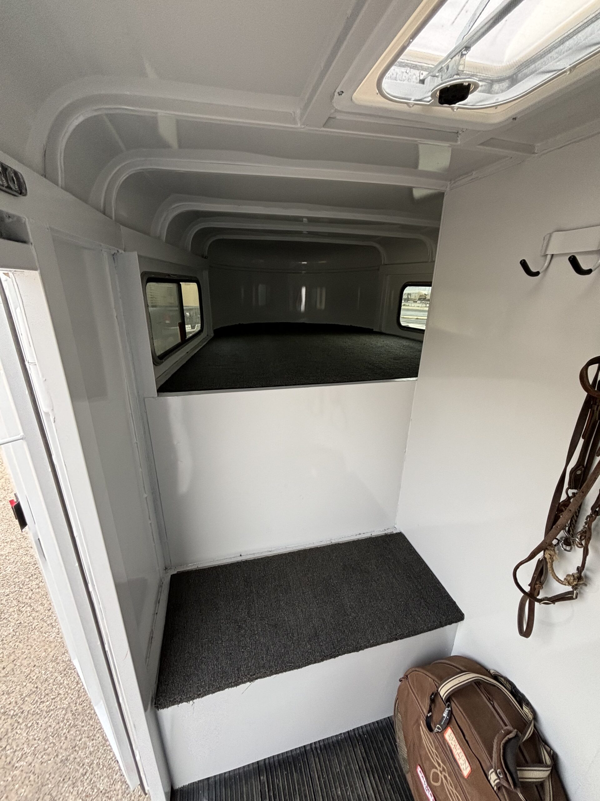 - Carpeted rear tack with saddle racks and bridle hooks